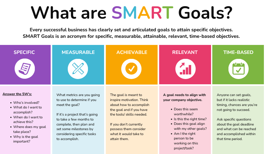. Focus on goals that are SMART (specific, measurable, attainable, realistic and targeted) or time bound
