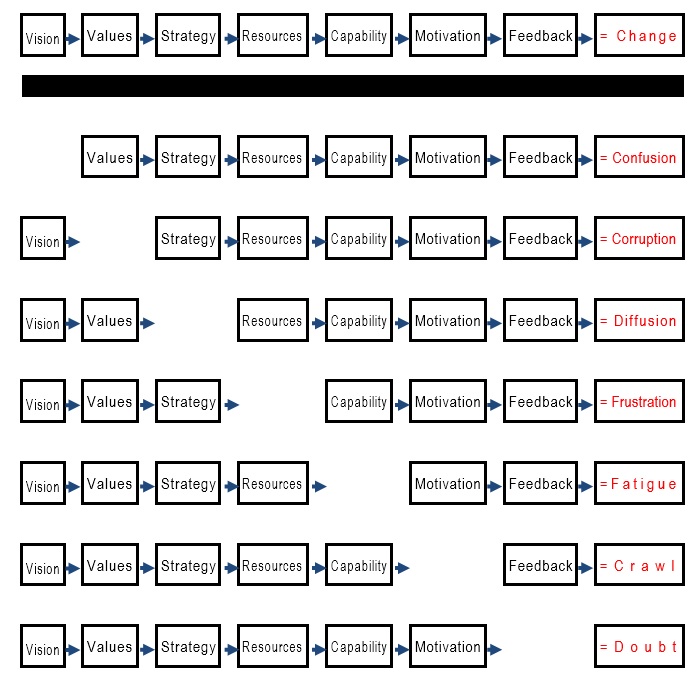 There are 7 important, interlinked elements needed to make change effective (see above the black line below). Below the black line (written in red) is what happens when one of these important element is missing, eg if vision is missing, confusion results, etc