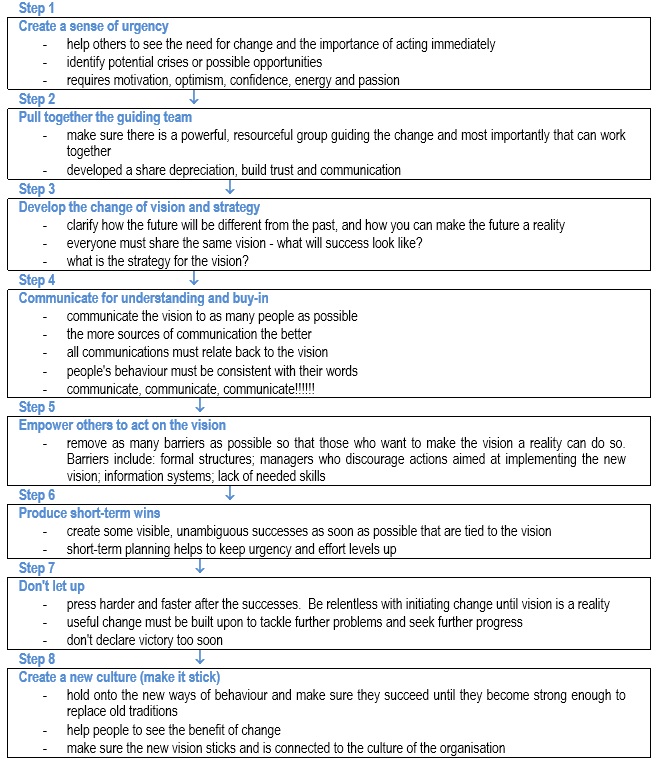 NB Steps 1 (create a sense of urgency) and 2 (pull together the guiding team) set the stage; step 3 (develop the change of vision and strategy) is deciding what to do; step 4 (communicate for understanding and buy in) to reinforce the purpose, step 5 (empower others to act on the vision), step 6 (produce short-term wins) and step 7 (don't let up) make it happen; step 8 (create a new culture) make the change stick.