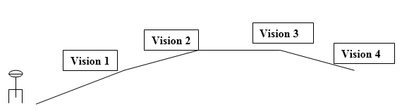 . The above diagram shows a person looking toward at the horizon. There are 4 plausible horizons for your organisation's future (Horizons 1 and 2 are the more immediate aspirations, while Horizons 3 and 4 are longer-term). Each has implications for your current strategy, ie Horizon 1 involves immediate issues like profitability and cash flow in the short-term. Pressures on these immediate issues can have significant impact on the longer-term aspirations and horizons. There is a temptation to fall back to the immediate issues and ignore the ramifications of the longer-term horizons.