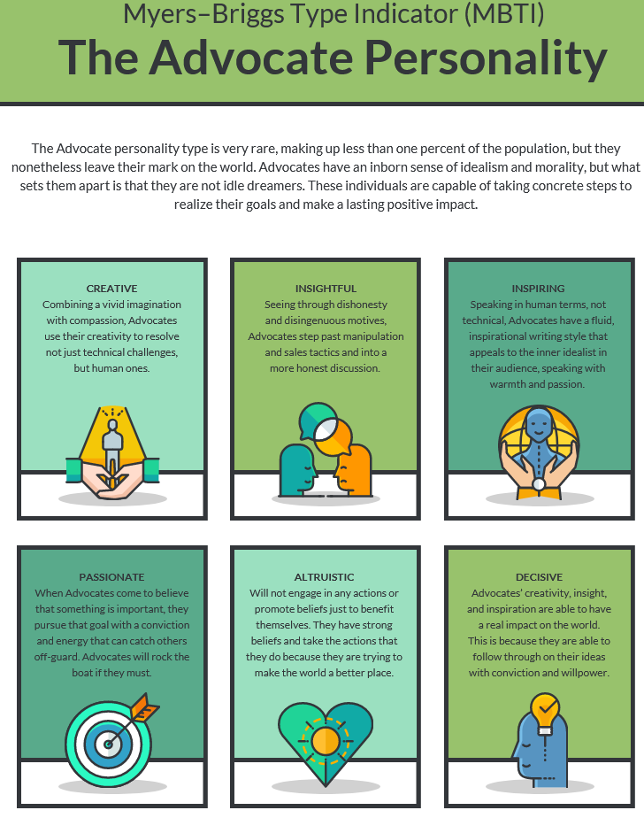 ‐ INFJ, ie people‐oriented innovator of ideas; serious, quietly forceful and persevering; concerned with the common good, with helping others develop