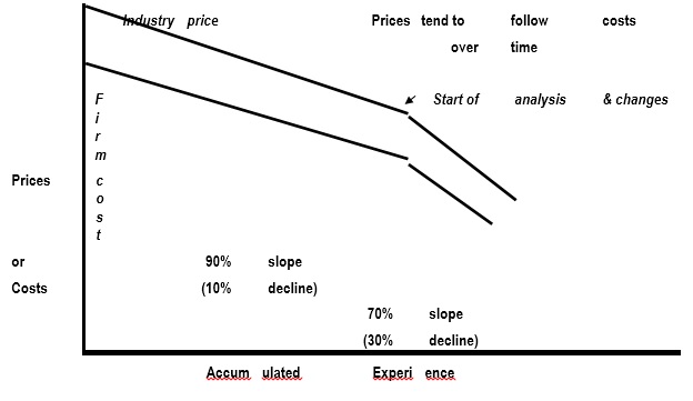 . Using the experience curve ‐ a graph showing the decline in an organisation's costs or prices as a function of accumulated experience (total units produced or services delivered) has doubled. For example, a 70% slope means that prices have dropped by 30%. Mapping your industry price curve against your own costs curve can help pinpoint cost-reduction objectives, ie