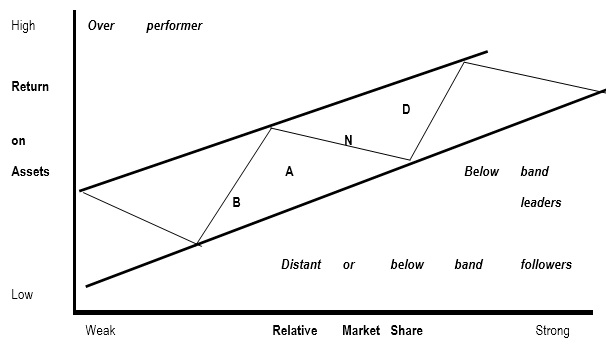 "...in-band leaders find that they can raise the bar for competitors by investing in still-greater market share and in product or service improvements. In-band followers usually need to work hard just to keep up; only occasionally can they jump into a leadership role through heavy investment in innovation ... Over-performers, which earn returns well beyond what their relative market share should suggest, typically need to maintain high-level investment in whatever has enabled them to escape the pull of the band ... might be a trusted or prestigious brand, an innovative or patented technology, exceptional loyalty ... below-band companies ... have probably not been managing their costs down the experience curve, which would be a primary reason for their underperformance..."