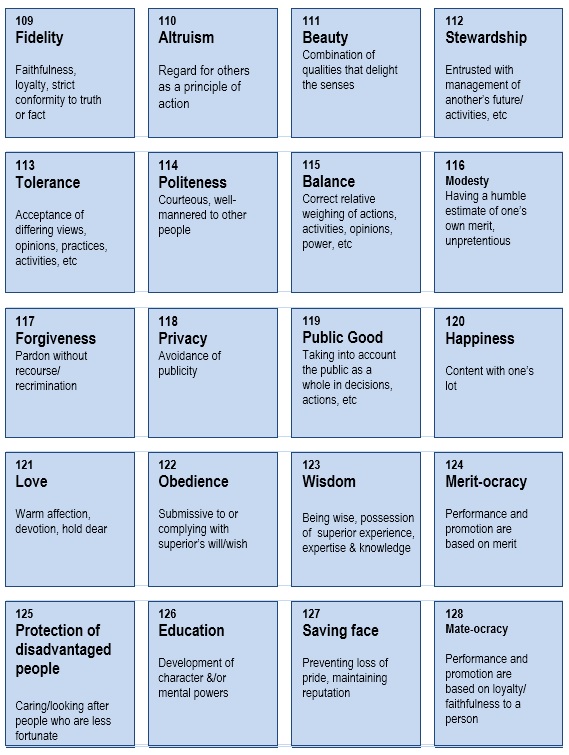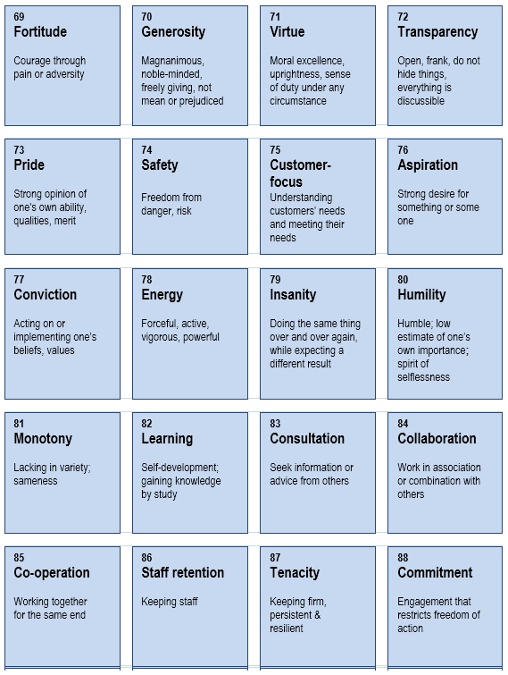 This tool uses around 140 separate and defined values cards; based on participants' perceptions of how the value is practised, each value card should be placed under one of the following headings