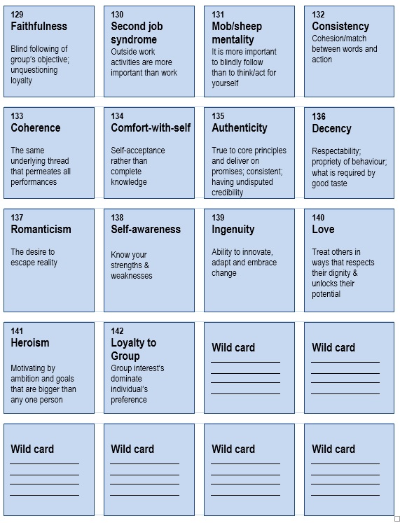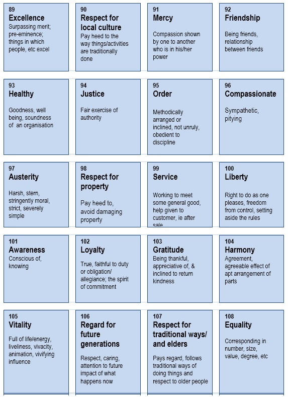 To help determine the values of your organisation/community, etc that are practised now and what values should be practised, a set of value cards has been developed.