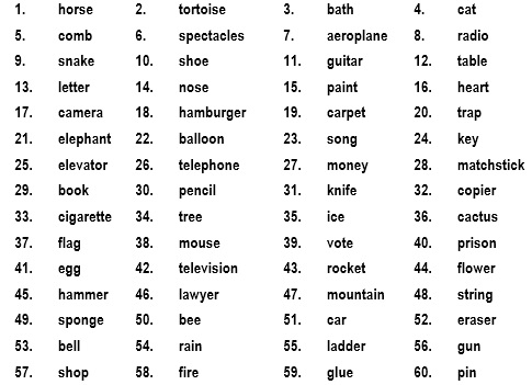 Alternatives to lists of words can be sourced from a dictionary (use nouns only), newspaper and picture cards