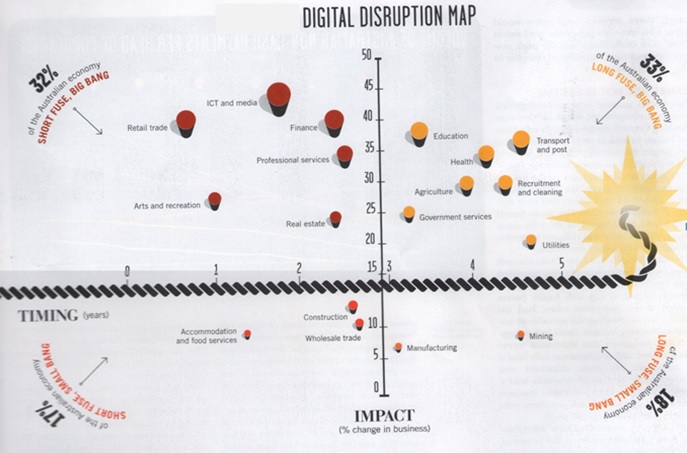 Below shows which industries are more threatened by digital disruption (source: Deloitte, 2013)