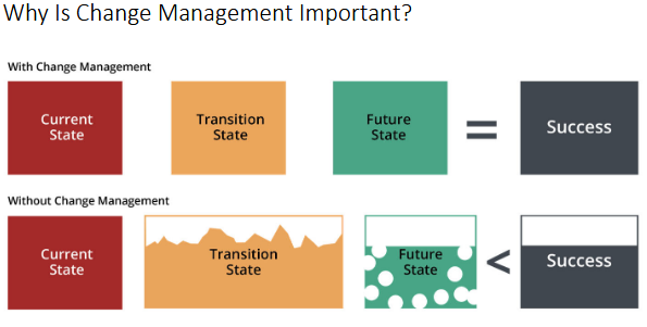 Change management is essential to help with the transition from the current state to the future state; without effective change management, it is highly unlikely you'll successfully reached the future state: