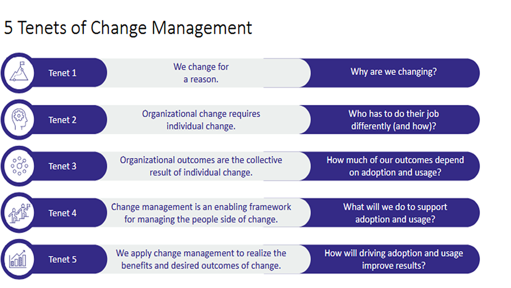 | 5 | We apply change management to realise the benefits and desired outcomes of change, ie improves the performance of the organisation with better outcomes | How will we drive adoption and usage to improve results? |