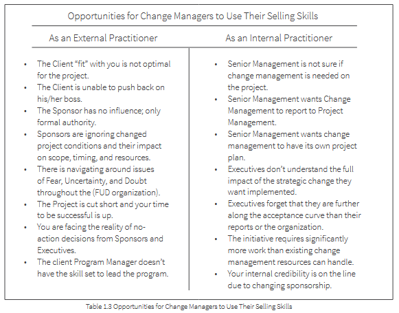 5. Recognise opportunities where you can exercise selling skills (being involved in the change initiative means opportunities will arise for using your change management selling skills; the table below lists some opportunities: